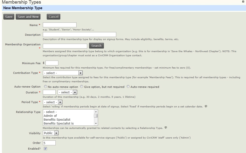 Membership types are the various membership categories that your organization offers. You can configure an unlimited number of membership types and set various options for each of them. To define your membership types, click on Administer > CiviMember > Membership Types > Add Membership Types.