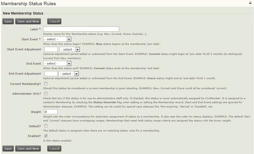 Membership status rules control the journey that contacts take through the membership process. By default the path is from pending, new, current, grace, expired. To define membership status rules, click on Administer > CiviMember > Membership Status Rules.