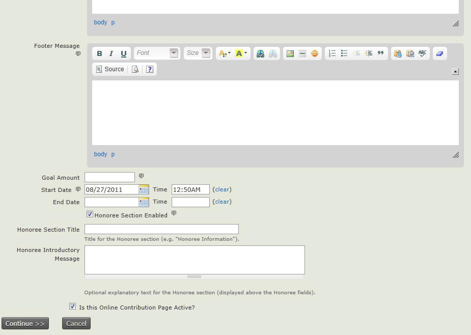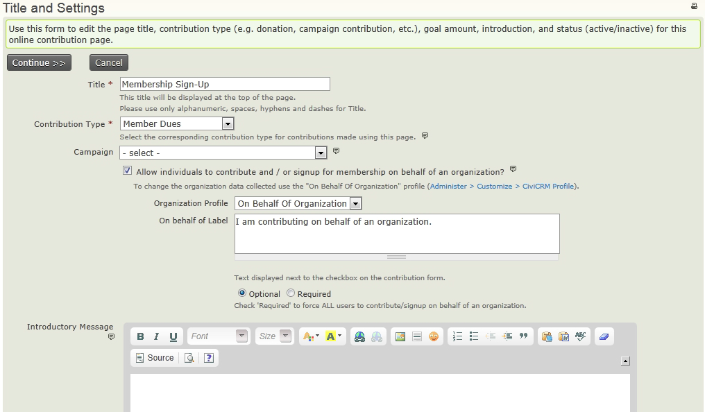 If you are using this online contribution page for both membership signup and general fundraising, you can make membership signup optional for constituents who just want to donate without becoming a member. If you checked the box for "Contributions Amounts section enabled" on Amounts tab to solicit additional contributions, you can decide whether such payments are recorded separately from membership fee payments.