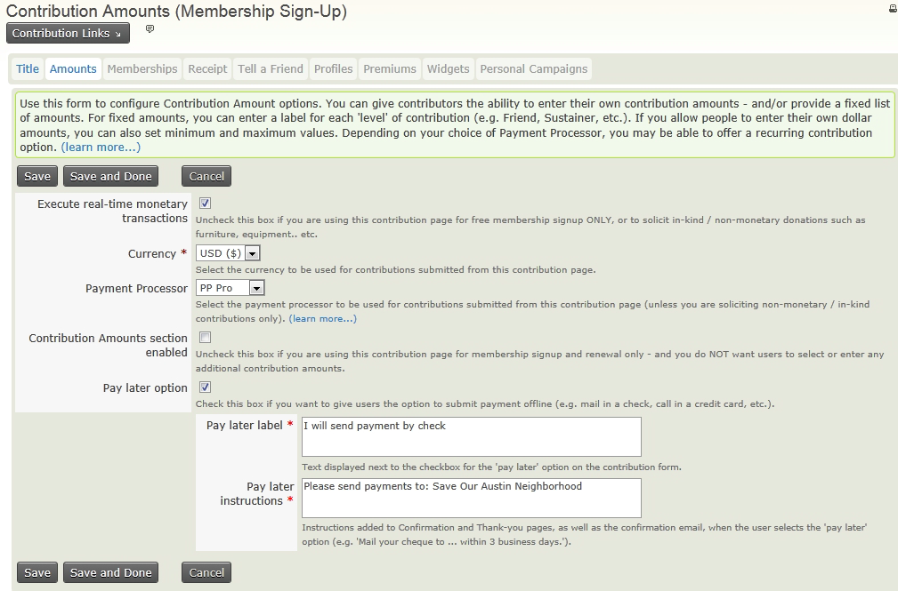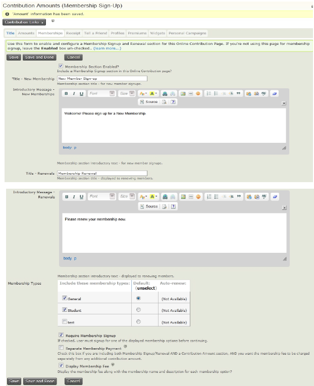 The next step in the contribution page setup wizard is designed specifically for memberships. You should ensure that Membership Section Enabled is checked.This page allows you to set text that can be displayed for both new memberships and renewals.