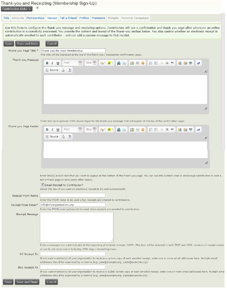 After the site visitor completes the membership signup or renewal form, he will be redirected to a thank-you page and can have an email receipt generated and sent to him. This fourth step in the wizard allows you to configure those options.