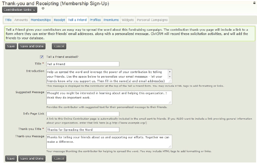 CiviCRM allows you to add a tell-a-friend feature to the thank-you page. The page lets your members share details about your organization with their friends by emailing them a link and information.