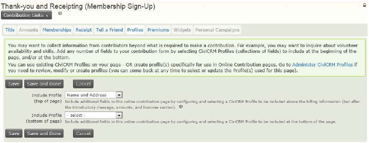 Profiles are critical to the functioning of membership signup and renewal pages. By default, contribution pages will include only an email field (which the member is required to fill in), in addition to the membership and contribution amount fields. Organizations almost always want to collect additional contact information as part of the membership signup process. Profiles provide these extra fields. On this step of the contribution page wizard, you may select one or more existing profiles for inclusion on the form.
