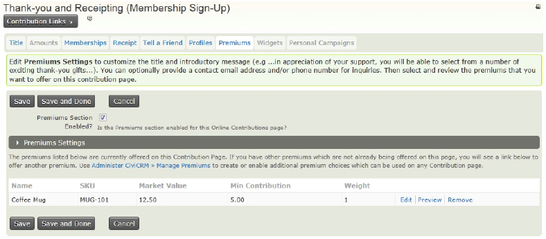 Premiums are thank you gifts and incentives offered to organization contributors. They are most commonly associated with tiered donation levels, though they could be created for use with memberships. Before including premiums on a contribution page, you must configure them through Contributions > Premiums (Thank-you Gifts).