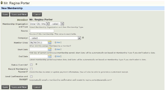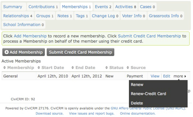 In the renewal process, the membership record end date is extended to reflect a new membership period. For example, if your organization's membership is handled on an annual basis from January through December, an existing end date of December 31, 2010 would be extended to December 31, 2011. CiviCRM calculates the end date extension based on the configuration for the specific membership type being renewed. Note that a members' join date (or Member Since date) is not modified when a membership is renewed, so you always know when the contact first became a member.