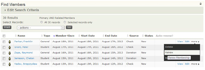 Over time, and after a few renewals, the membership record will be a single membership record whose end date is extended, with multiple related financial transactions representing each renewal purchase.