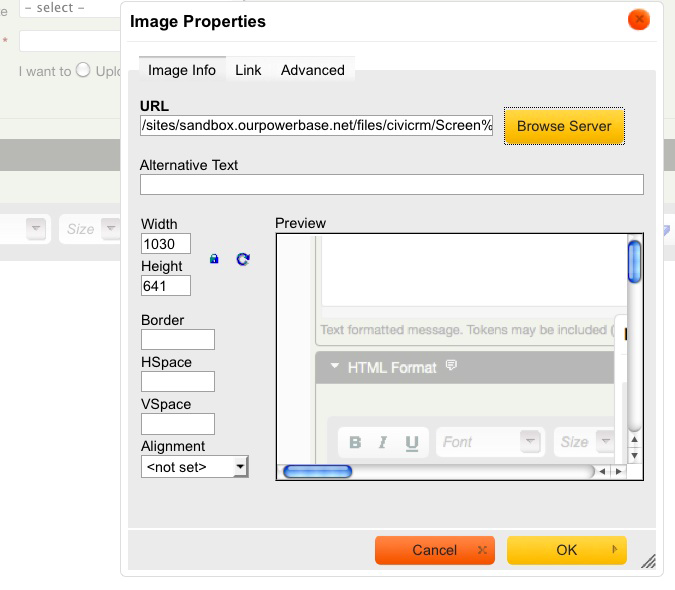 To insert the uploaded images, select the desired file and click Insert File. You'll return to the Insert Image window of CiviMail. Here you can adjust image alt text, size, and alignment.