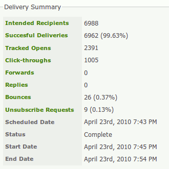 Click throughs shows the total number of times that people have clicked links in email.Forwards show the amount of times people have forwarded the email using the forward link which is a token that you can include in your mailing. Replies shows the number of times that people have replied to the email if you have enabled reply tracking. Bounces show the number of email addresses that could not be successfully delivered to if you have enabled bounce processing. Unsubscribe requests shows the amount of people that have clicked on any unsubscribe links that you include in your email.